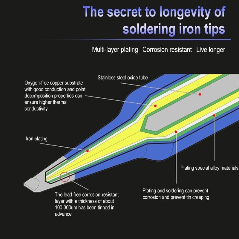 - Copper, as a heat conductor, is the main component of the soldering iron head. About 85% of the soldering iron head materials, copper has good thermal conductivity, which is conducive to the rapid heating of the soldering iron head. Good soldering iron heads are made of copper, but some manufacturers use brass, in order to reduce costs, but also reduce the thermal conductivity of the soldering iron head. Iron, which acts as an anticorrosion, is the key factor affecting the service life of the iron head. Good soldering iron head has fine and dense crystal structure and good corrosion resistance. This soldering iron head has long service life and good tin effect. Manufacturers with poor iron plating technology mainly rely on the thickness of the iron plating layer to control the service life of the iron head. Usually, the iron plating layer is thicker and the iron head is not tin, thin and durable. Nickel - plays an anti rust role in iron plating, and is convenient for subsequent chromium plating. Chromium - non stick tin prevents the use of tin to run on the iron head. The general chrome plated time is more than 5 minutes, and the ordinary decorative chrome plating is about 1 minutes. Tin - in the head, in the use of sticky tin parts. This is the composition of the iron head material, indispensable.
