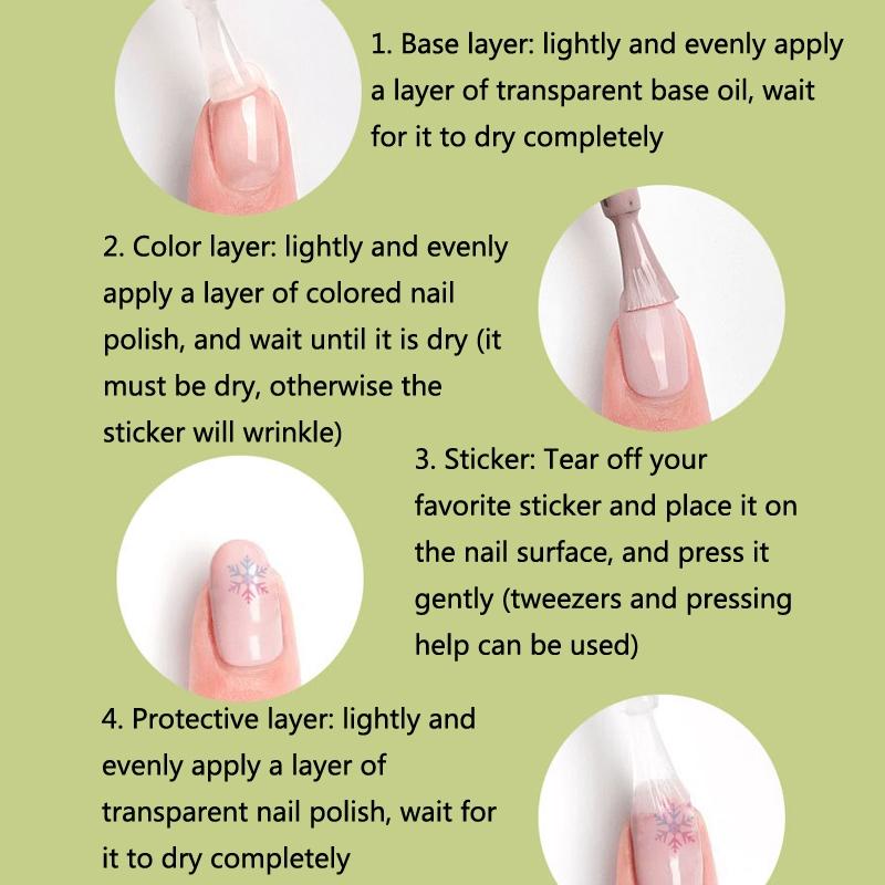 3. Sticker: Tear off your favorite sticker and place it on the nail surface, and press it gently (tweezers and pressing help can be used)