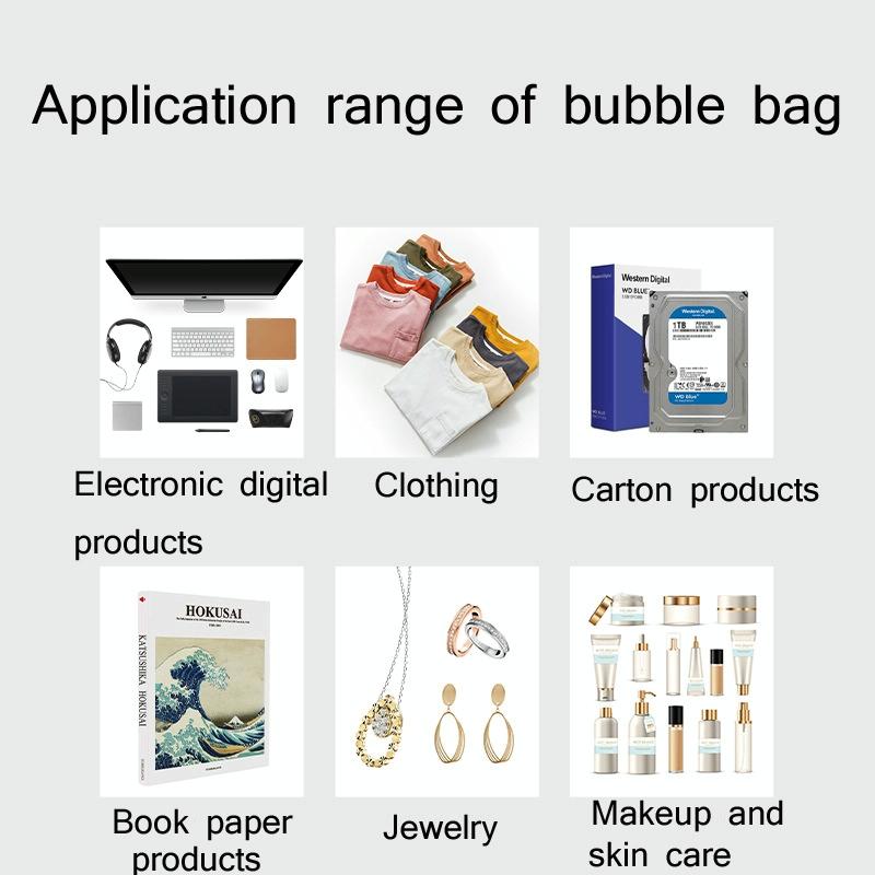 2. Application scope of bubble bag: electronic digital products, clothing, paper box products, books and paper products, jewelry, cosmetics and skin care, etc.
