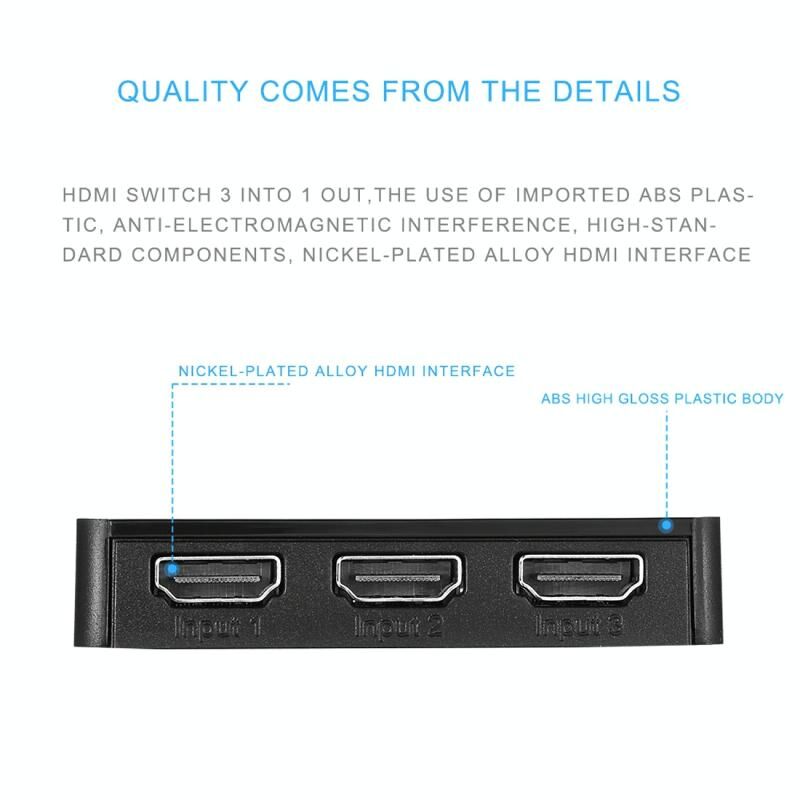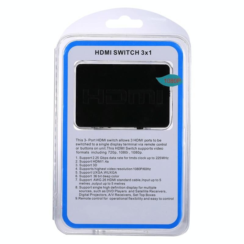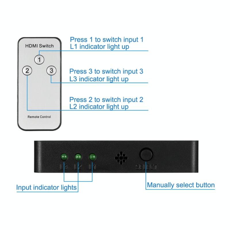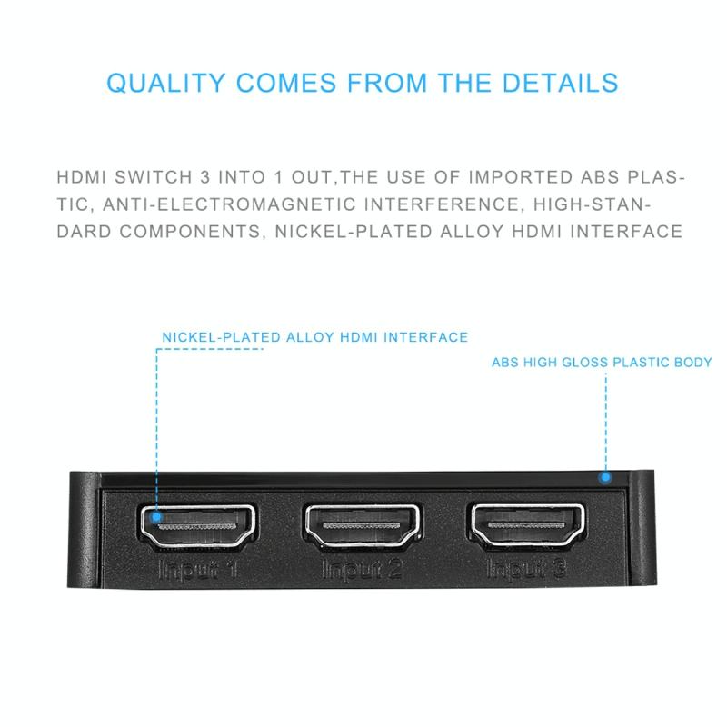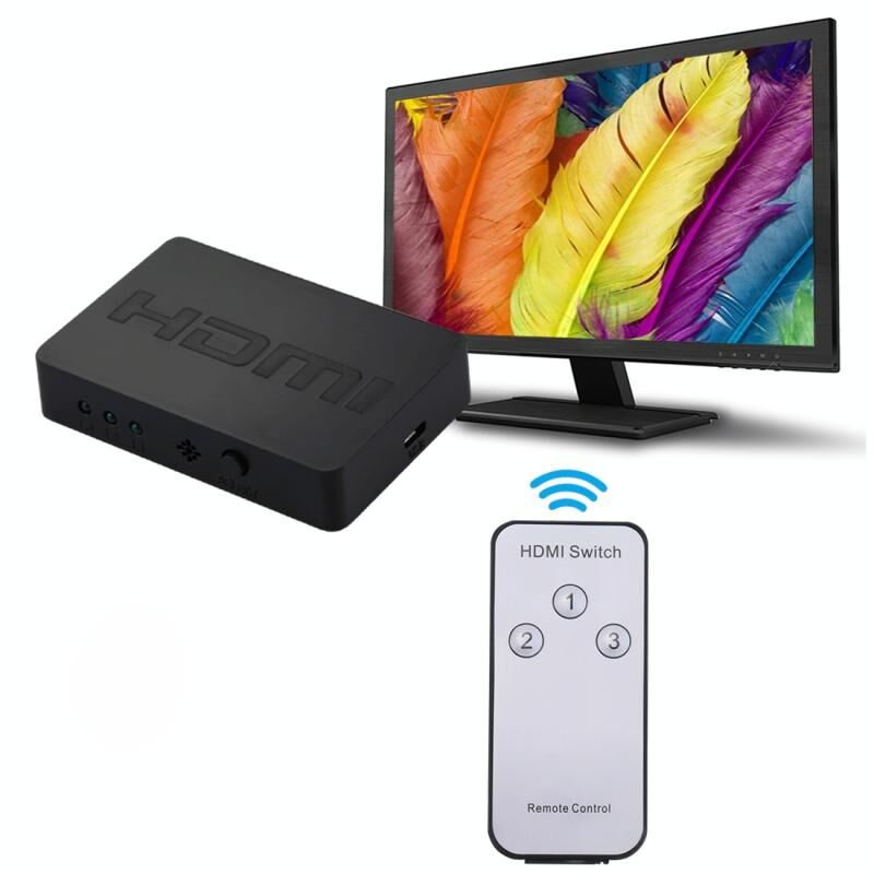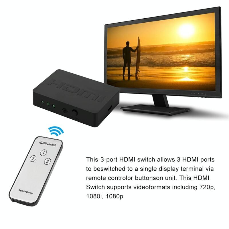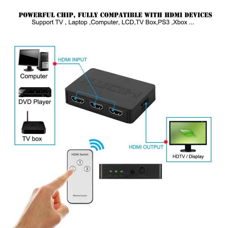 1. This 3 port HDMI switch allows 3 HDMI ports to be switched to a single display terminal via remote control or buttons on unit, this HDMI switch supports video formats includeing 720p, 1080i, 1080p