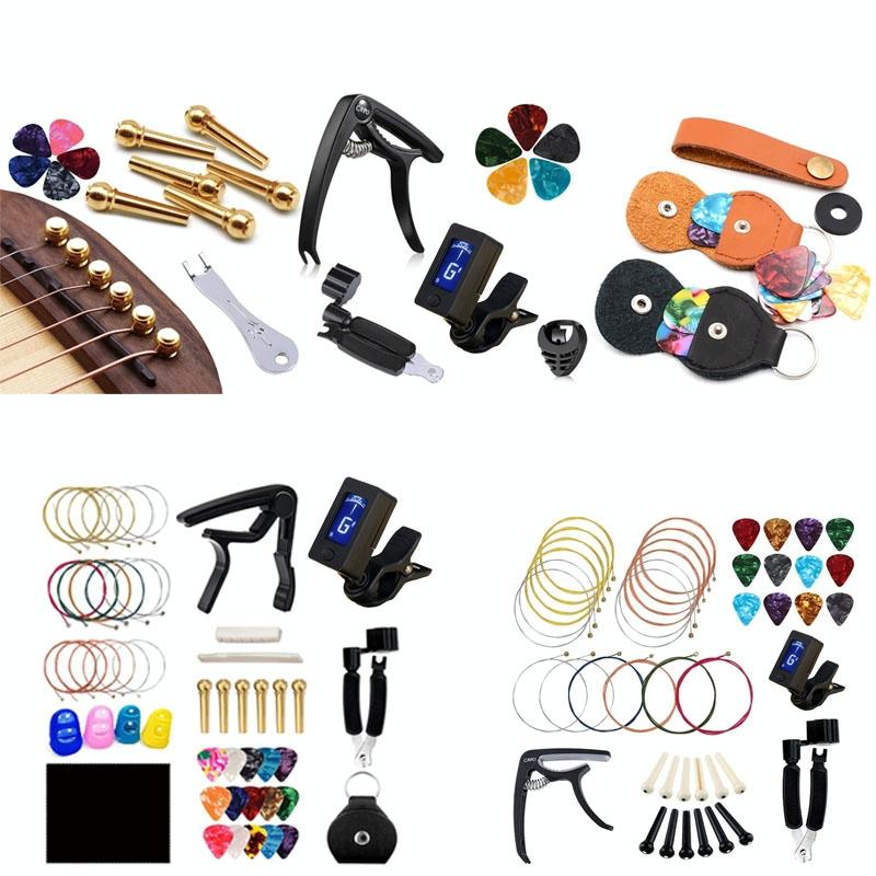 1. Specification: string x 3(red copper, ballad, color string)+tuning clip x 1+Tuner x 1+plastic upper and lower string pillow x 1+three-in-one string changer x 1+copper fixed string nail x 6+black cloth x 1(15x15mm)+guitar finger cover x 4(large, large, medium, medium+pick x 15(5 pieces 0.46mm, 5 pieces 0.71mm, 5 pieces 0.96mm)+black pick pack x 1