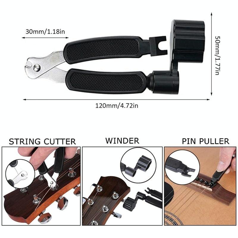 1. Specification: modulation clip x 1(black)+pick x 5(0.46mm random color)+tuner x 1+3-in-1 string changer tool x 1+black pick box x 1