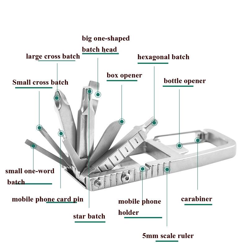 4. Tool belt 13 functions: large cross batch, big one-shaped batch head,Small cross batch, small one-word batch, mobile phone card pin, 5mm scale, star batch, box opener, hexagonal batch, carabiner, bottle opener, mobile phone holder, 1/8 inch scale