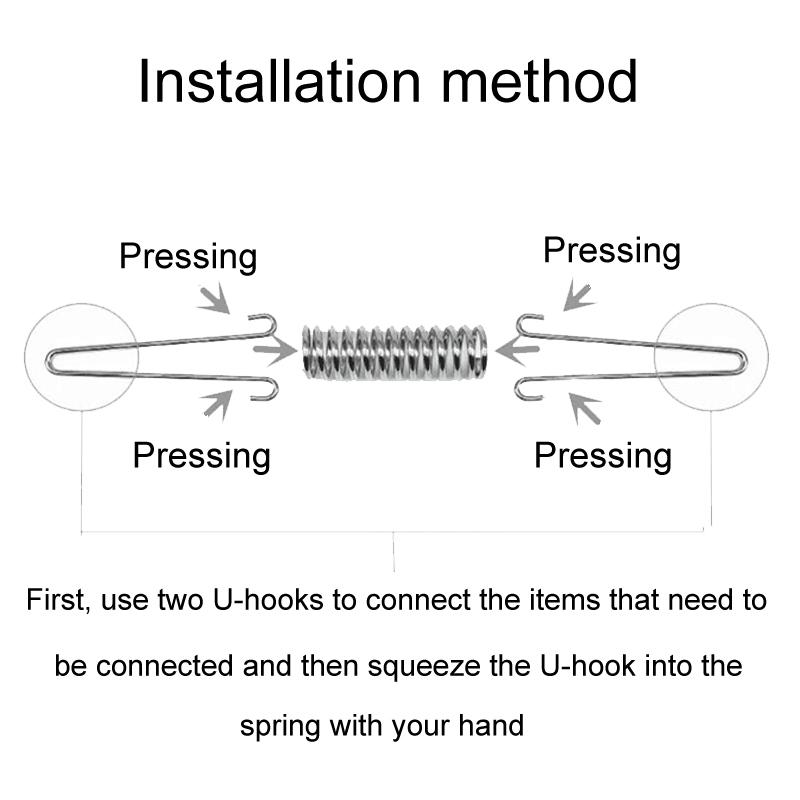 6. Installation method: first use 2 U-shaped hooks to connect the items to be connected, and then squeeze the U-shaped hooks into the spring