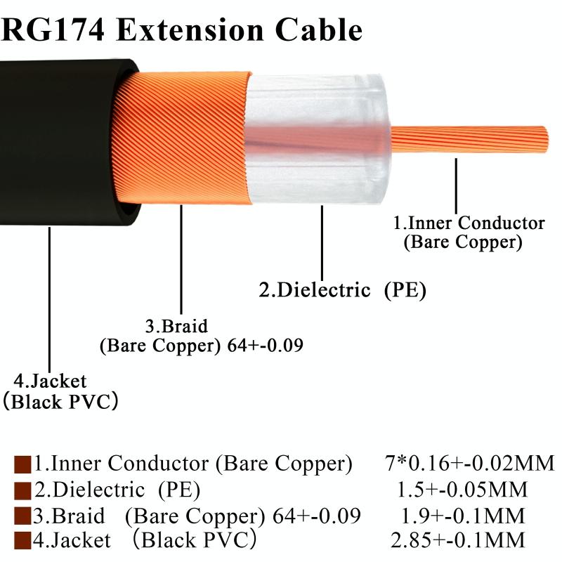1. Durability& Performance: The material of cable is RG174 to ensure good conductivity and signal transmission.