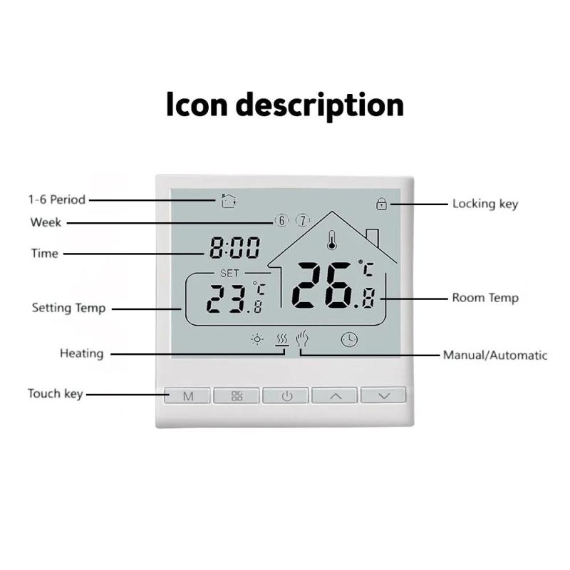 1. The smart thermostat offers a 6-stage weekly programming function, allowing users to set different temperatures for each day of the week. This enables personalized temperature control and helps save energy.