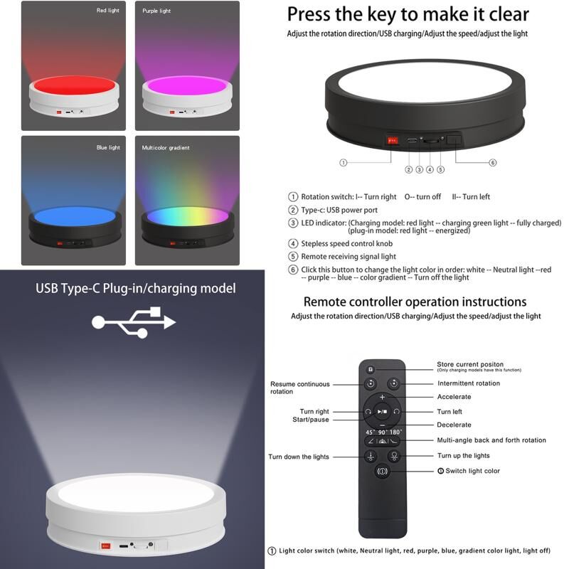 22cm Colorful LED Light Electric Rotating Display Stand Turntable, Style:Power Plug-in(White)