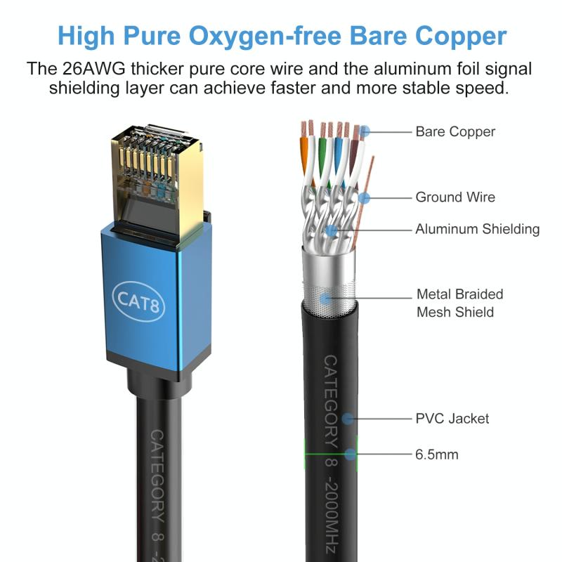 1. The core of the Cat8 10 Gigabit Ethernet cable uses 4 shielded foil twisted pairs (F/FTP) and 26AWG single-strand OFC core, which is durable.
