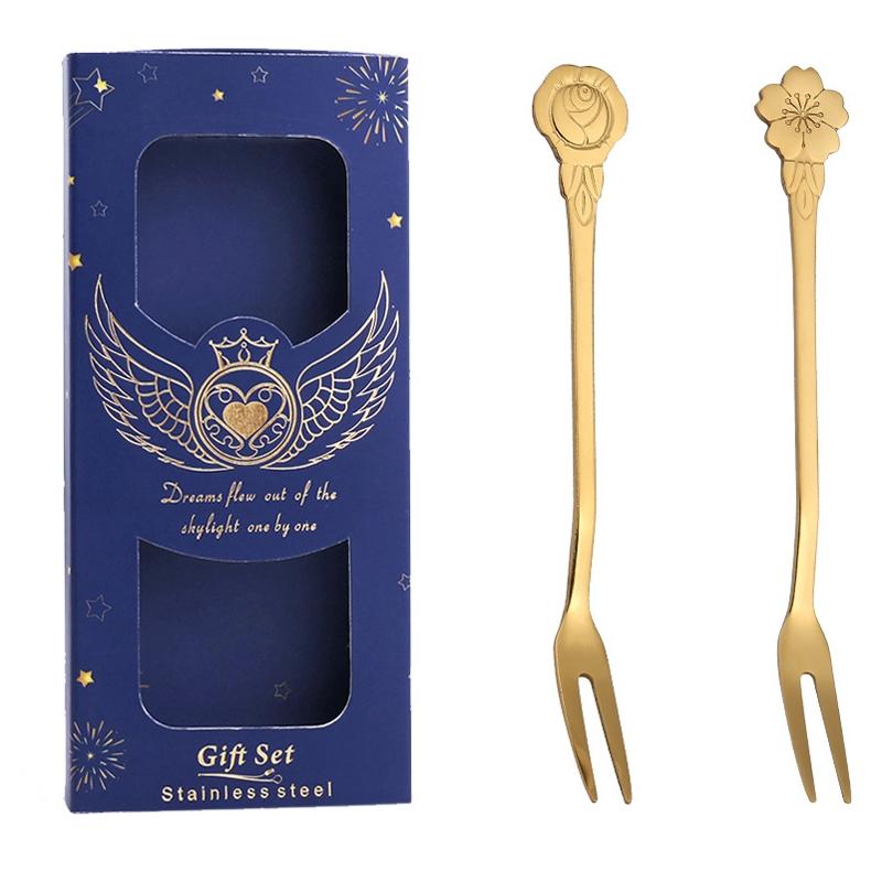 2pcs /Pack Stainless Steel Spoon And Fork Cutlery Set, Style: Flower Fork+Blue box (Gold)