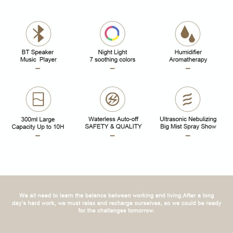 1. Main functions: Bluetooth audio, clock alarm clock, aromatherapy humidification, seven-color ambient light