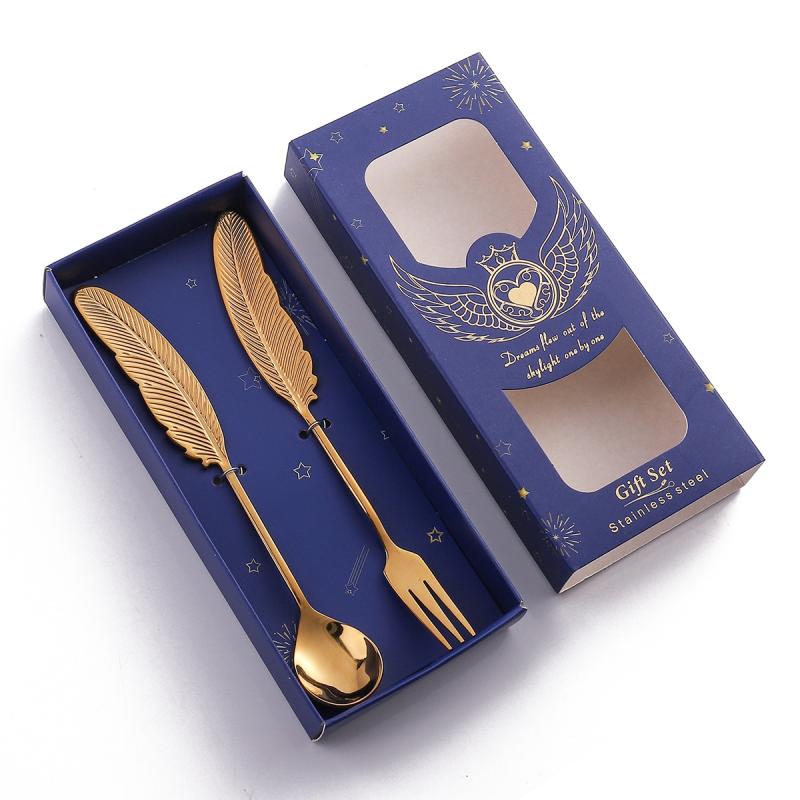 304 Stainless Steel Feather Spoon Fork Literary Tableware,Style: 2 In 1 Titanium-Blue Box