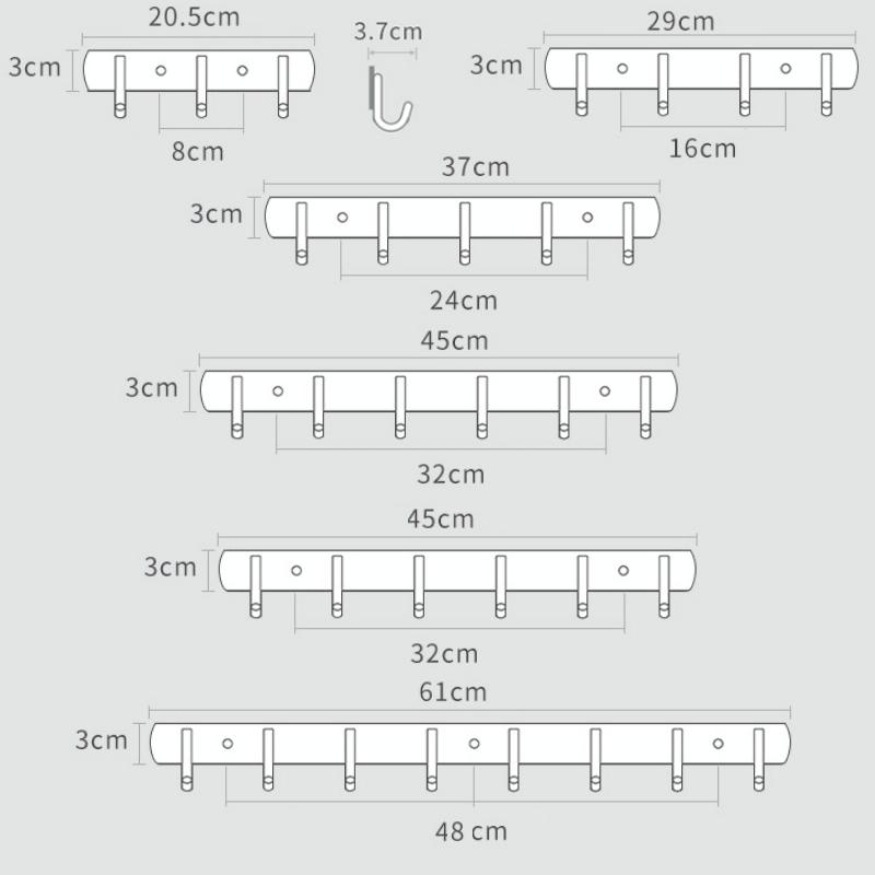 7. Size: 3 hooks 20.5x3 cm, hole spacing 8 cm; 4 hooks 29x3 cm, hole spacing 16 cm; 5 hooks 37x3 cm, hole spacing 24 cm; 6 hooks 45x3 cm, hole spacing 32 cm; 7 hooks 53.5x3 cm , the hole spacing is 40 cm; the 8 hooks are 61x3 cm, the hole spacing is 48 cm; the 201 butterfly hook is 6 cm long and the hole spacing is 3.5 cm