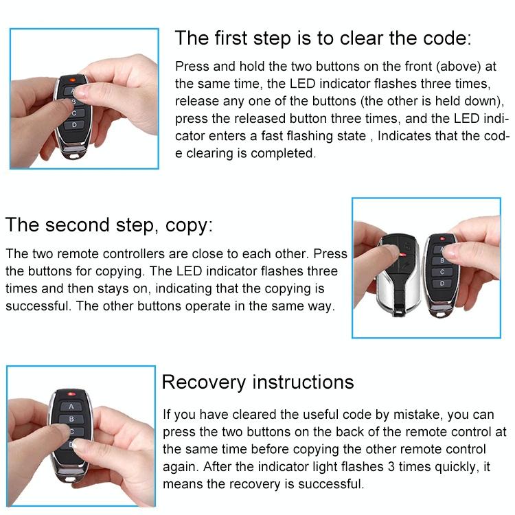 10. Application field: suitable for remote control matching and copying of electric door remote control, retractable door remote control, garage door remote control, motor control remote control, curtain control remote control, LED light remote control, automobile and motorcycle remote control, industrial equipment remote control, etc.