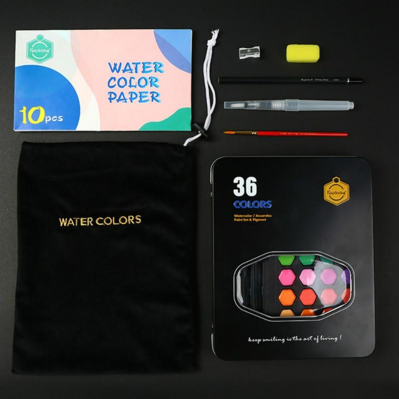 Package includes: 1. solid watercolor 36 colors, 2. flannel gift bag x 1, 3. watercolor pen x 1, 4. fountain pen x 1, 5. watercolor pen x 1, 6. pencil x 1, 7. absorbent sponge x 1, 8. Silver Pencil Sharpener x 1