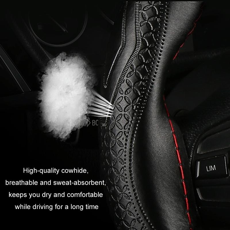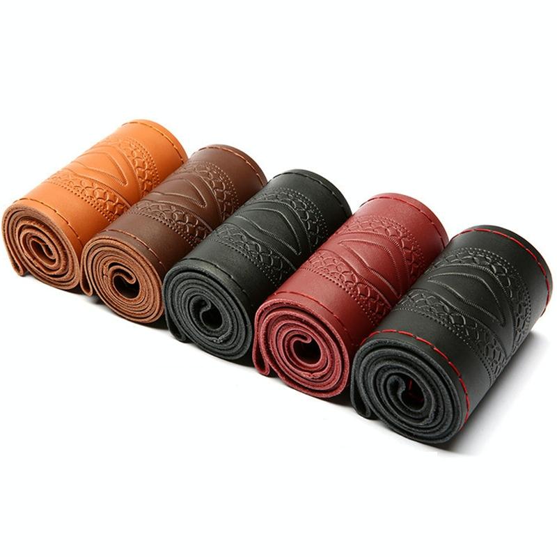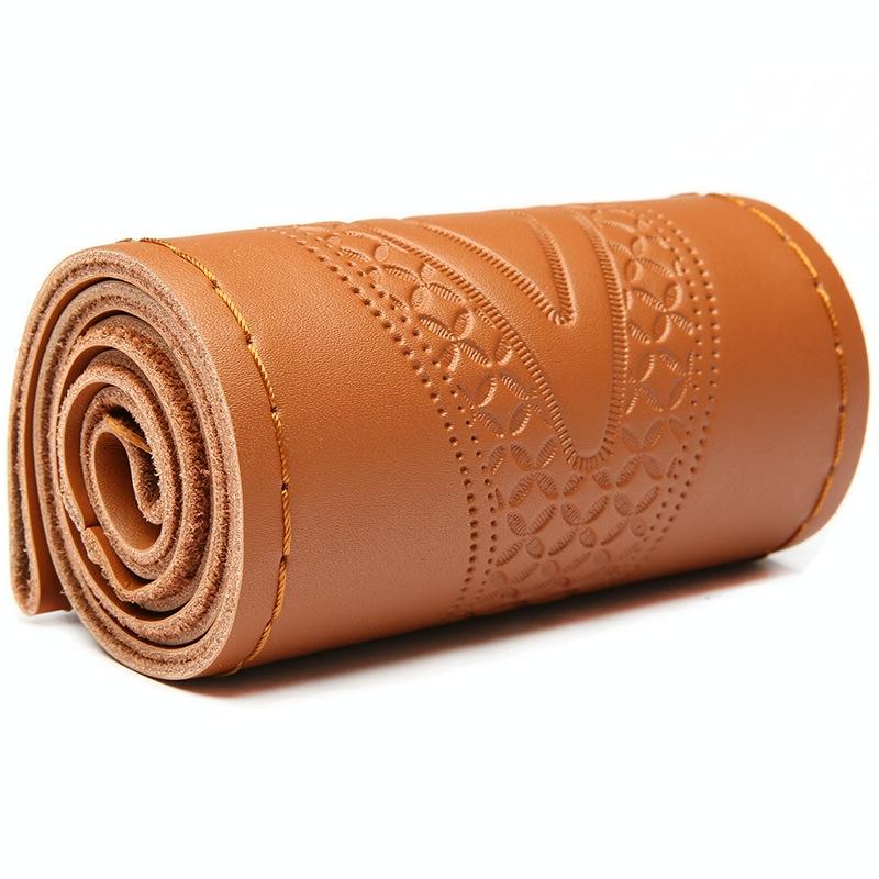 38cm Four-Season Embossed Hand-Sewn Cowhide Steering Wheel Cover(Brown)