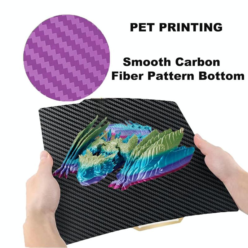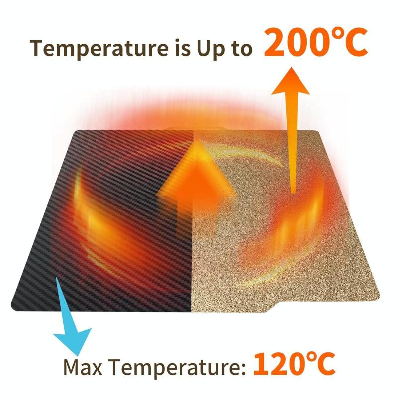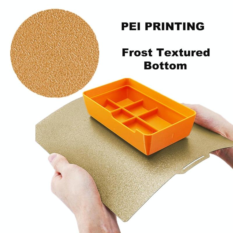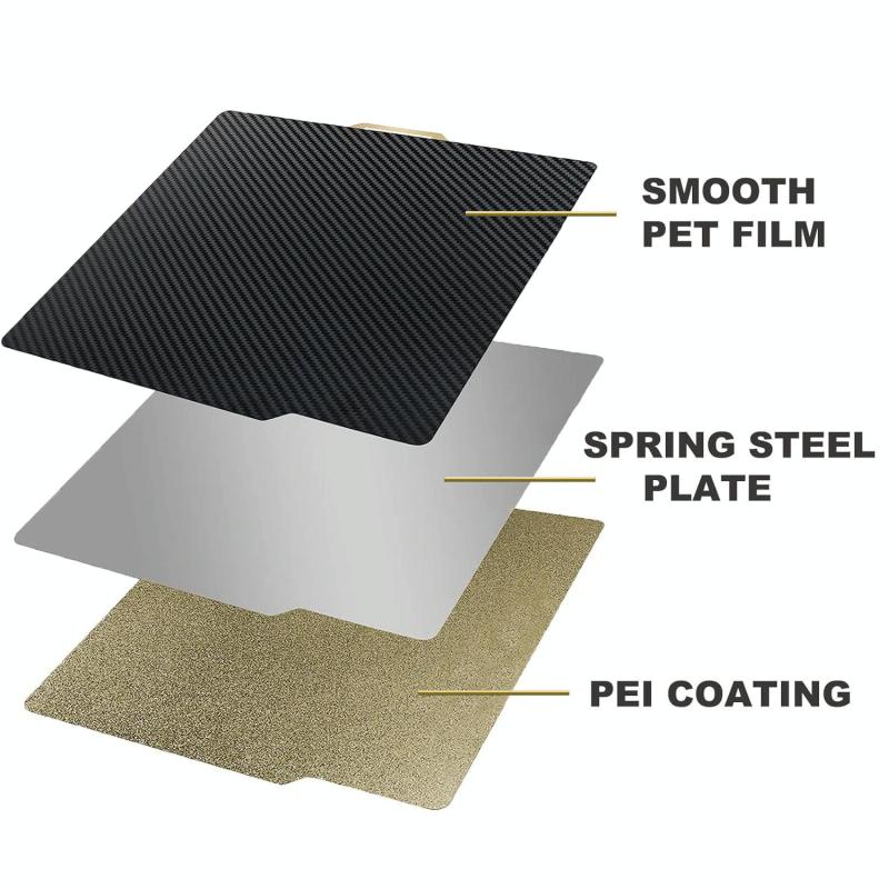 4. Compatible Filaments: The film surface is smooth and easy to clean, and can be well adhered to various consumables. The PEI coating surface has a matte texture and can print materials such as PLA/PETG/PC/ABS/TPU/nylon.