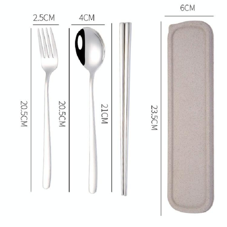 2. Dimensions: box 23.5×6 cm, chopsticks 21 cm long, spoon 20.5×4 cm, fork 20.5×2.5 cm
