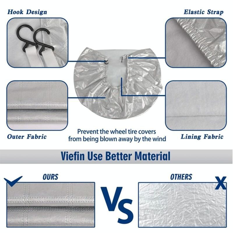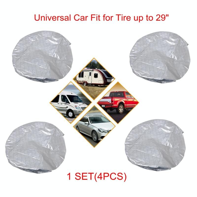 3. This tire cover is made of waterproof aluminum material, thick cotton wool lining, durable. Ita??s Protect the tires and wheels from sun damage, dirt,rust, corrosion and all types of weather when your vehicle is parked. Keep your tires free of scratches, in order to make your tires life more durable. Because tires left exposed to the sun and other environmental hazards will deteriorate much faster than you might think and could potentially lead to on-road blowouts as well as costly replacement.