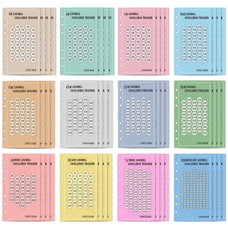 1. The Money Saving Challenge Card (front) fits A6 zippered cash envelopes (not included), providing an effective solution to saving money easily. There are 12 colors in total, 4 pictures of each color. With the low-cost Financial Planner Budget Book Cards, you can fully enjoy the fun of the savings challenge, save on various budgets and DIY the savings budget you want to save.