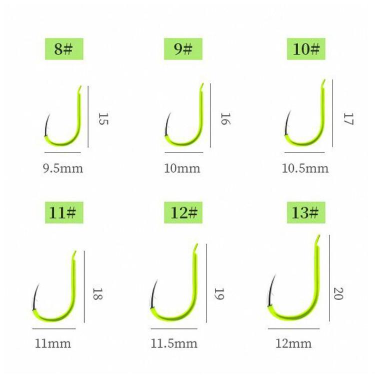 2. Dimensions: fish hook No. 8: 9.5×15 mm, No. 9: 10×16 mm, No. 10: 10.5×17 mm, No. 11: 11×18 mm, No. 12: 11.5×19 mm, No. 13: 12×20 mm, line length 40 cm, spring 11×30 mm