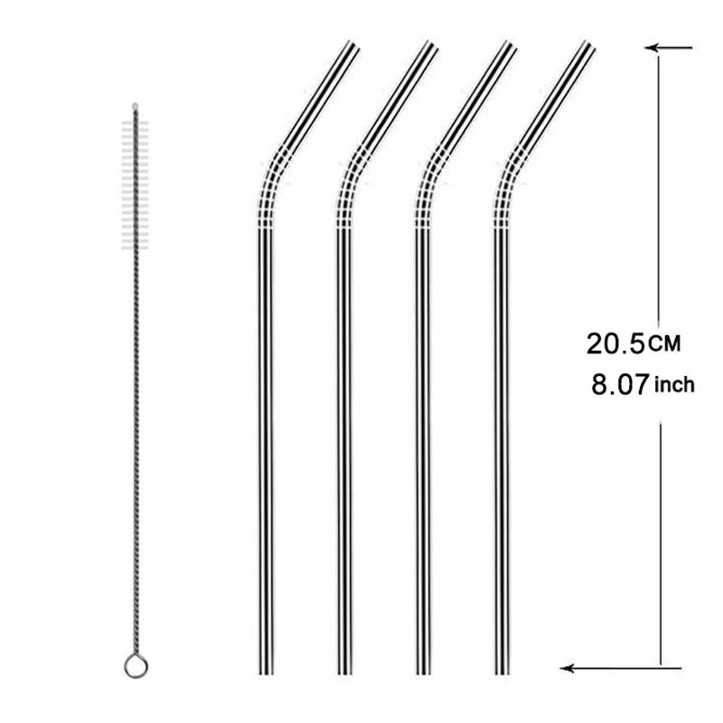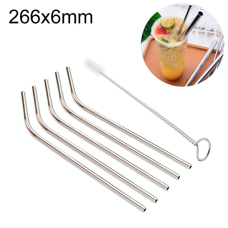 5pcs Reusable Stainless Steel Bent Drinking Straw + Cleaner Brush Set Kit, 266*6mm(Silver)