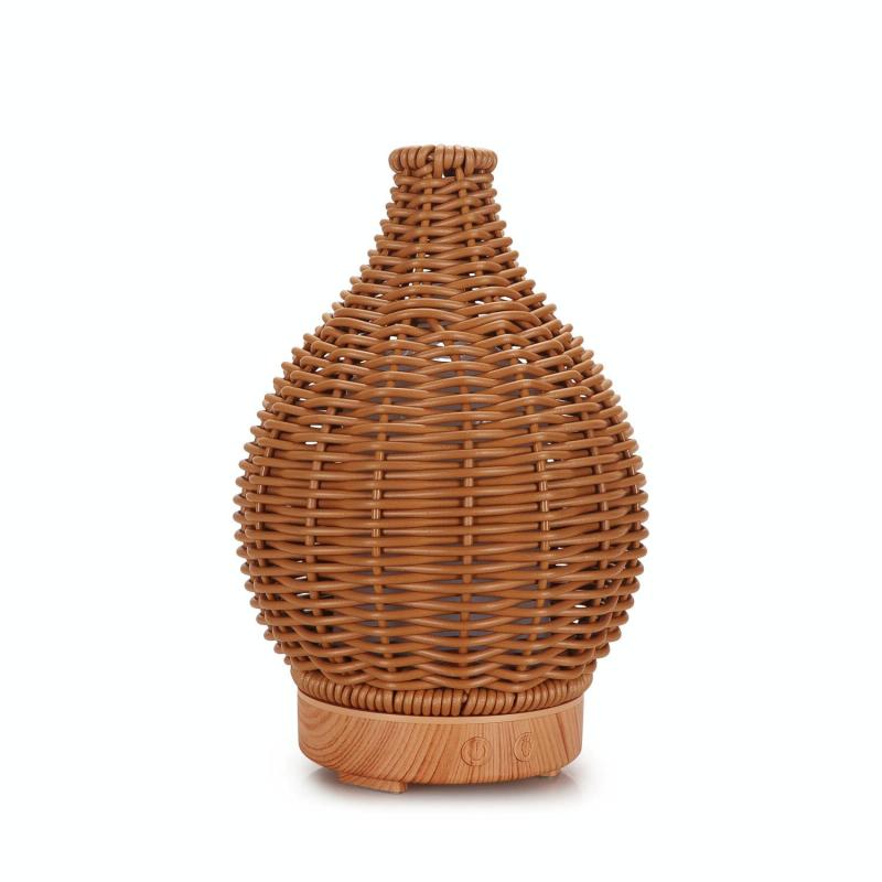 1. A compact 3-in-1 device combining humidification, aroma diffusion, and ambient lighting, featuring a modern rattan-inspired design with 7-color LED modes for home/office use.
