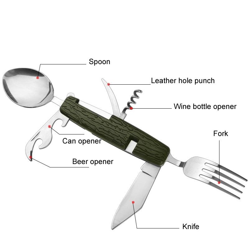 2. Multifunctional: spoon, leather punch, red wine bottle opener, fork, can opener, beer bottle opener, knife