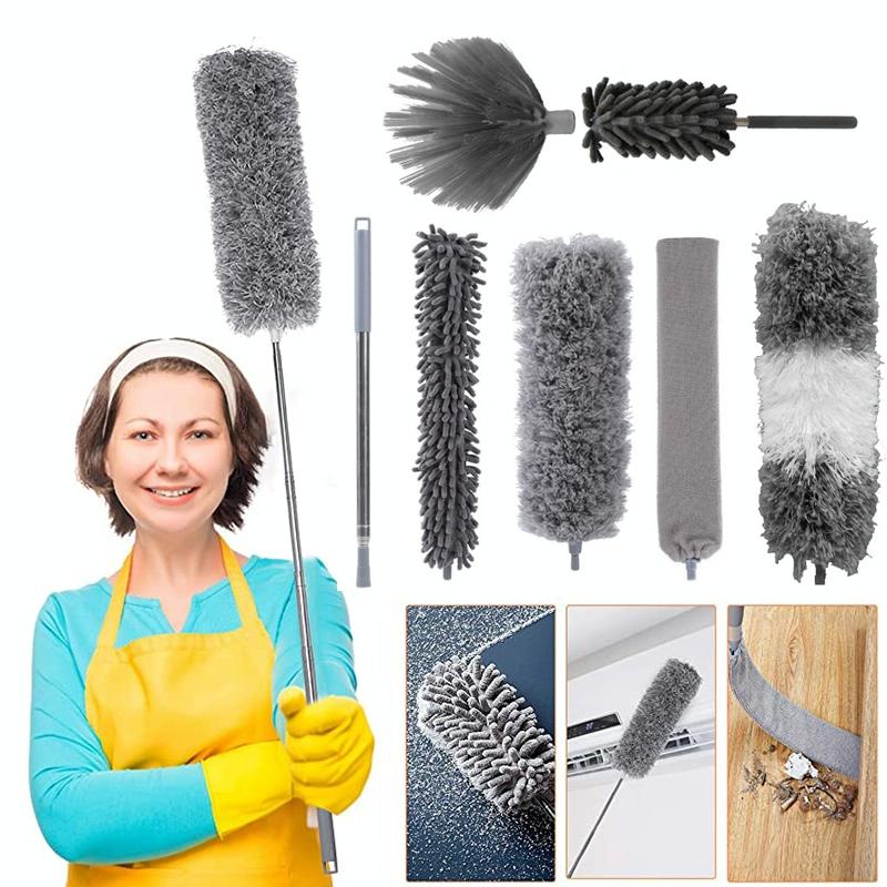 -7-piece set: telescopic pole + chenille brush + 2pcs different microfiber brush + crevice brush + spider web brush + mini dust brush