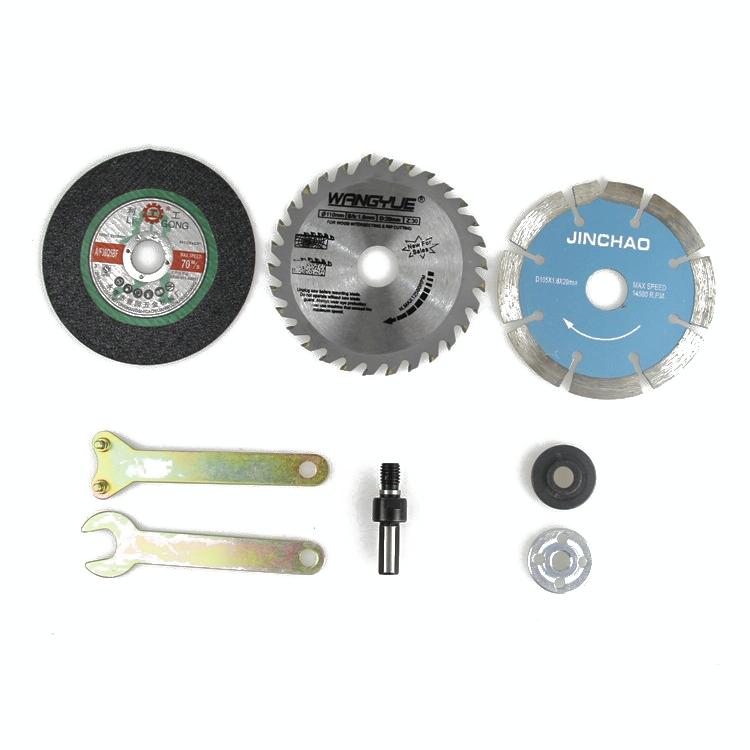 6. The 7-piece set includes: metal cutting blade, metal polishing blade, Mitsubishi handle, black and white pressing plate, wrench x 2, 8 piece set including: metal cutting blade, wooden piece, marble blade, Mitsubishi handle, black and white pressing plate, wrench x 2, 9-piece set contains: metal cutting discs, metal polishing discs, wooden mats, marble discs, Mitsubishi handle, black and white pressure plate, wrench x 2