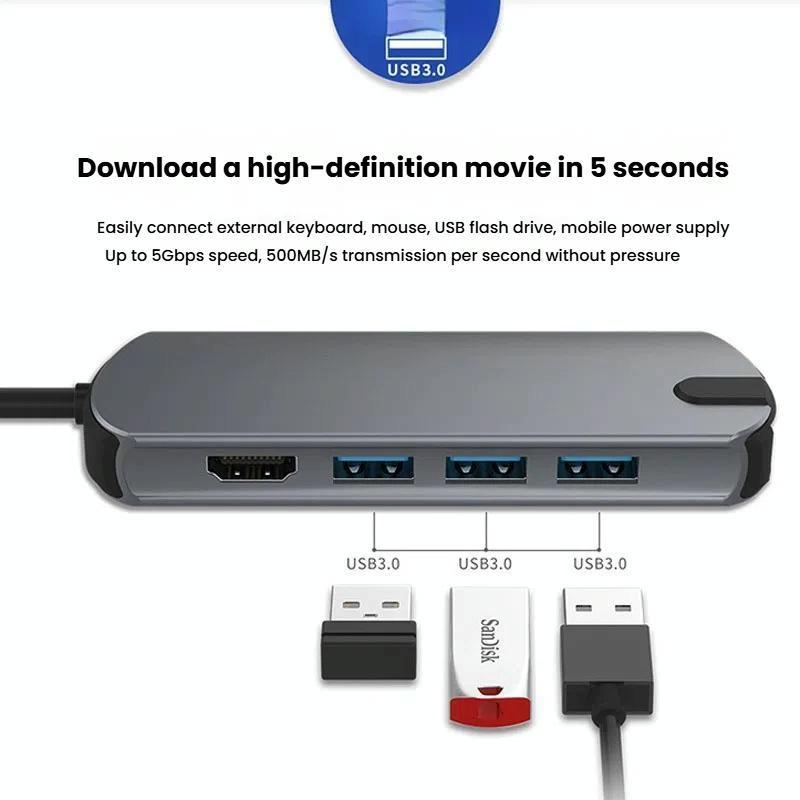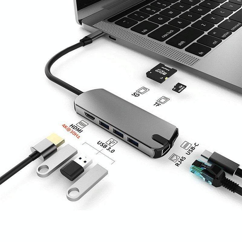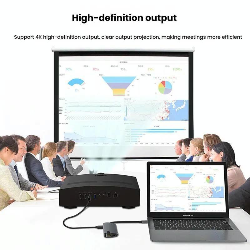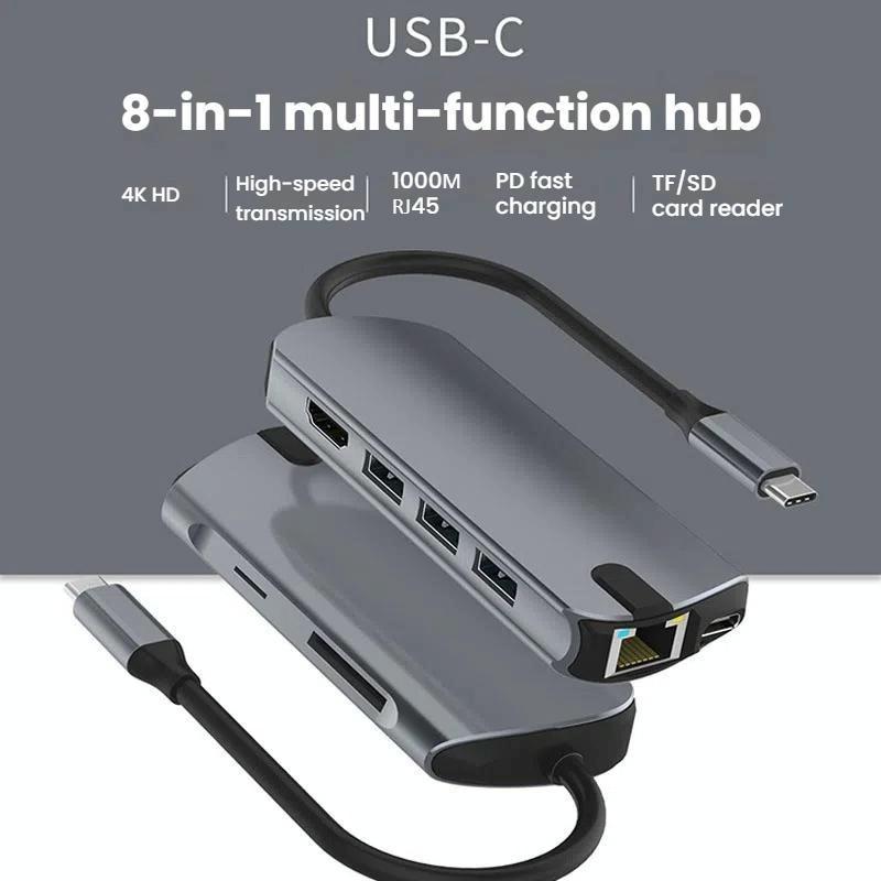 1. 8-in-1 multi-function docking station, integrated Gigabit Ethernet port + 4K HDMI + 3 x USB 3.0 + PD fast charging + SD and TF card reader, making the laptop interface more diverse