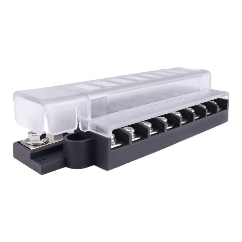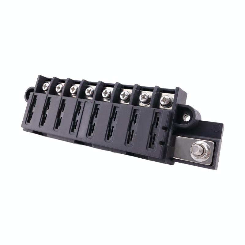 1. The fuse box is equipped with a negative busbar and a moisture-proof cover. All busbars and fuse clips are made of nickel-plated copper, which is corrosion-resistant and has good electrical conductivity.