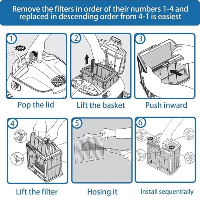 3. The filter of the pool cleaner can be easily popped off and can be rinsed directly from the filter with a garden hose, quickly clean the dirt in the filter, and the filter is reusable!