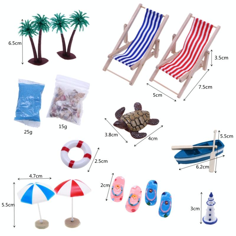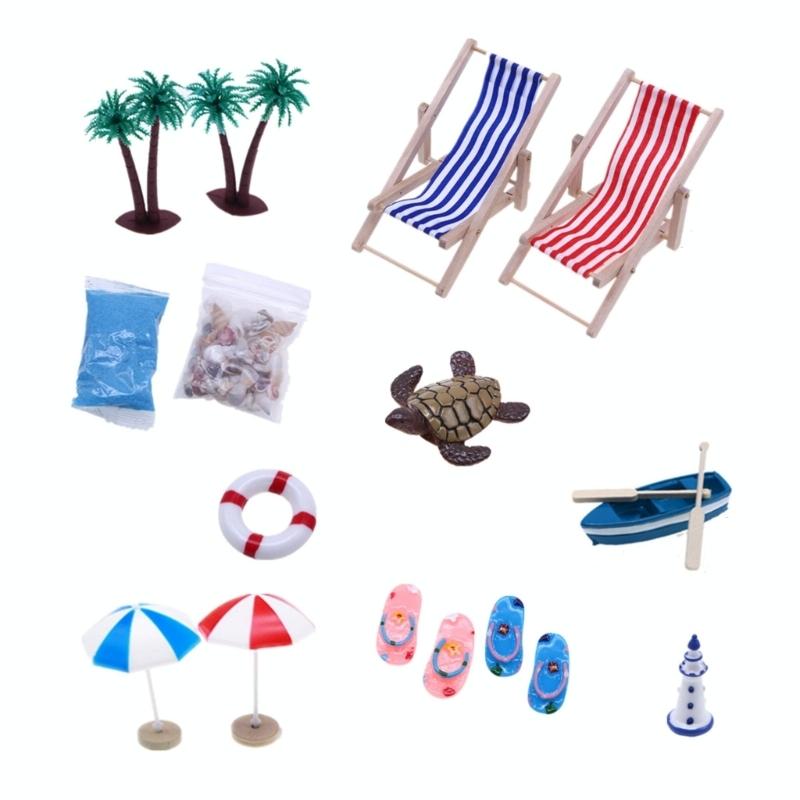 1. This mini beach set is the perfect addition to a DIY dollhouse garden or dollhouse collection, complete with miniature parasols, chairs, boat and miniature landscape.