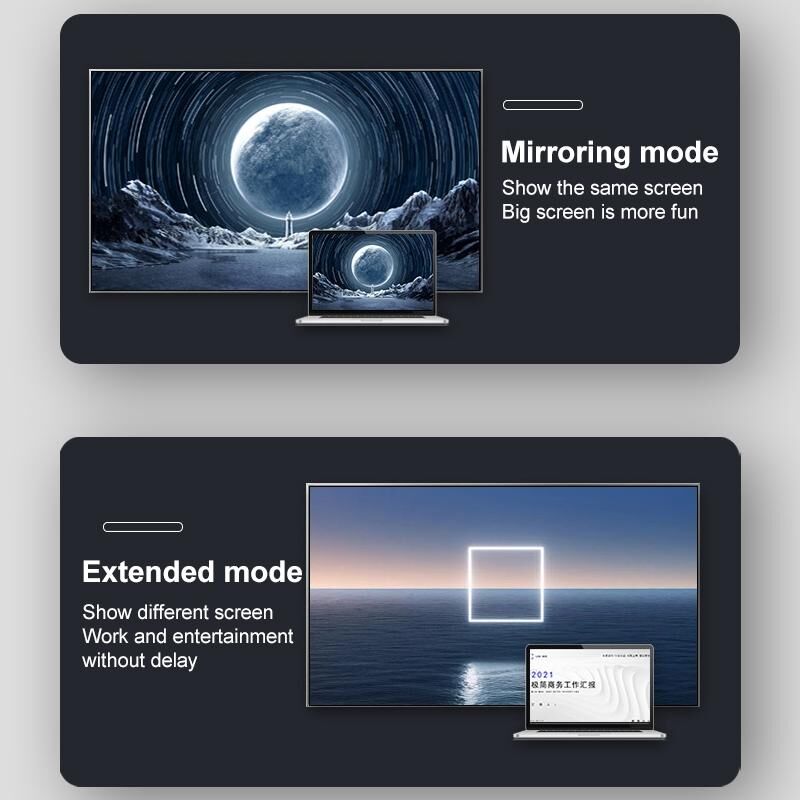 7. Support two projection modes, same screen/extended dual mode plug and play, no driver required