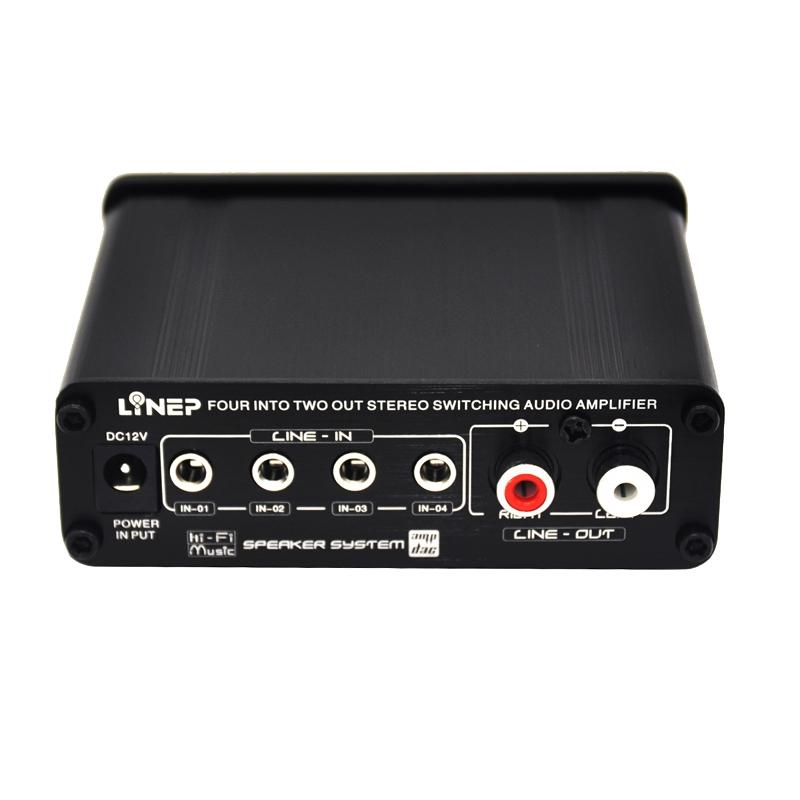 10. The front-end output adopts 3.5mm interface, the back-end output adopts RCA interface. 11. 11. Simultaneous output of balance circuit architecture is enabled in front-end and back-end, output can be connected to the headphone, stereo, amplifier or any other equipment, used as sound signal amplifying switcher for four-channel signal input and two-channel signal output.