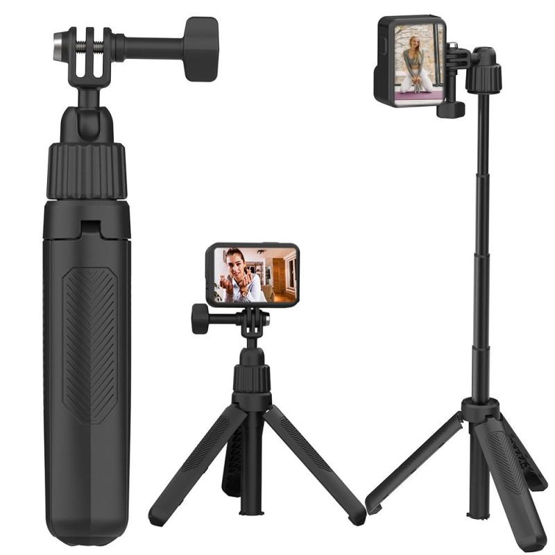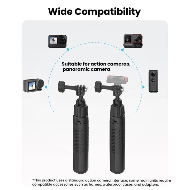 1. Integrates selfie stick and tripod functions, allowing easy mode switching to adapt to various shooting scenarios. The universal dual-claw adapter is compatible with various action cameras, such as the Insta360 Ace series / DJI Osmo Action series / GoPro HERO series. (Some ameras require use with accessories like frames, waterproof cases, or adapters).