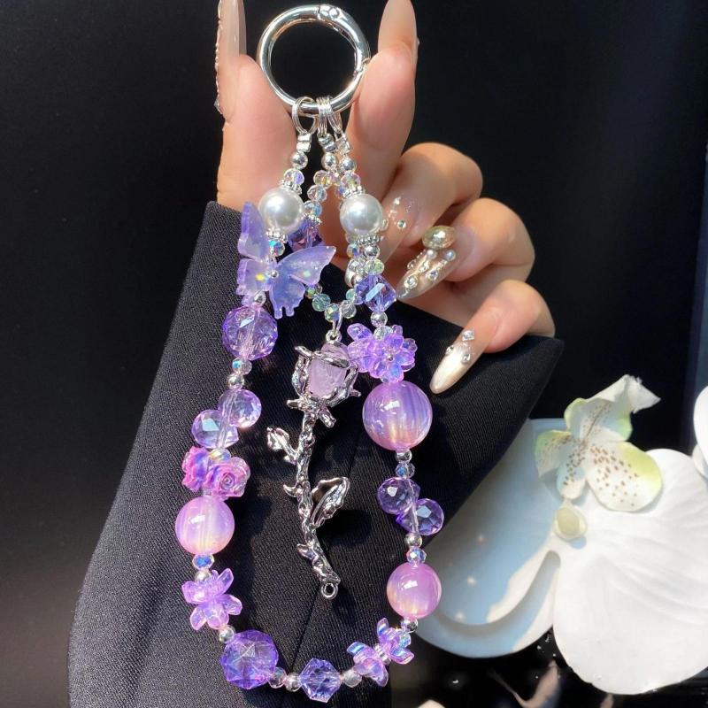 Alloy Rose Pendant Crystal Cell Phone Chain Beaded Wrist Lanyard(Purple)