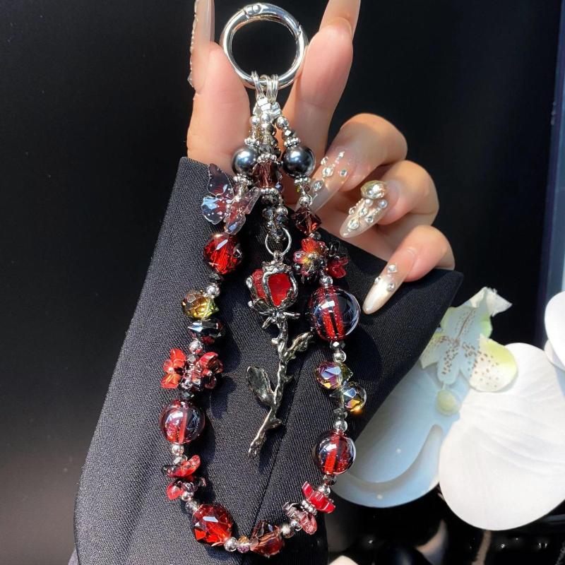 Alloy Rose Pendant Crystal Cell Phone Chain Beaded Wrist Lanyard(Red)