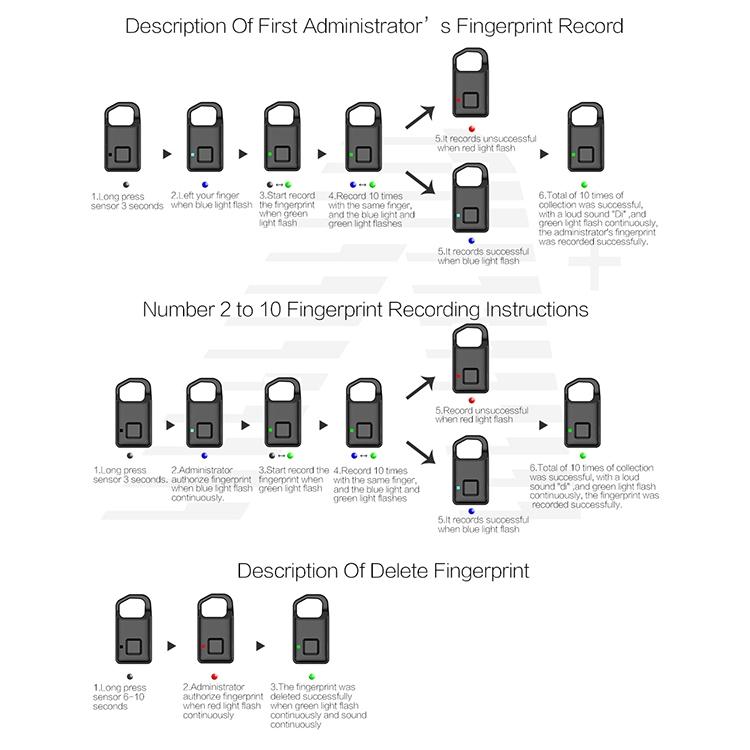 5. Short press to unlock, press and hold for 5 seconds to set the fingerprint, long press for 10 seconds to delete the fingerprint.