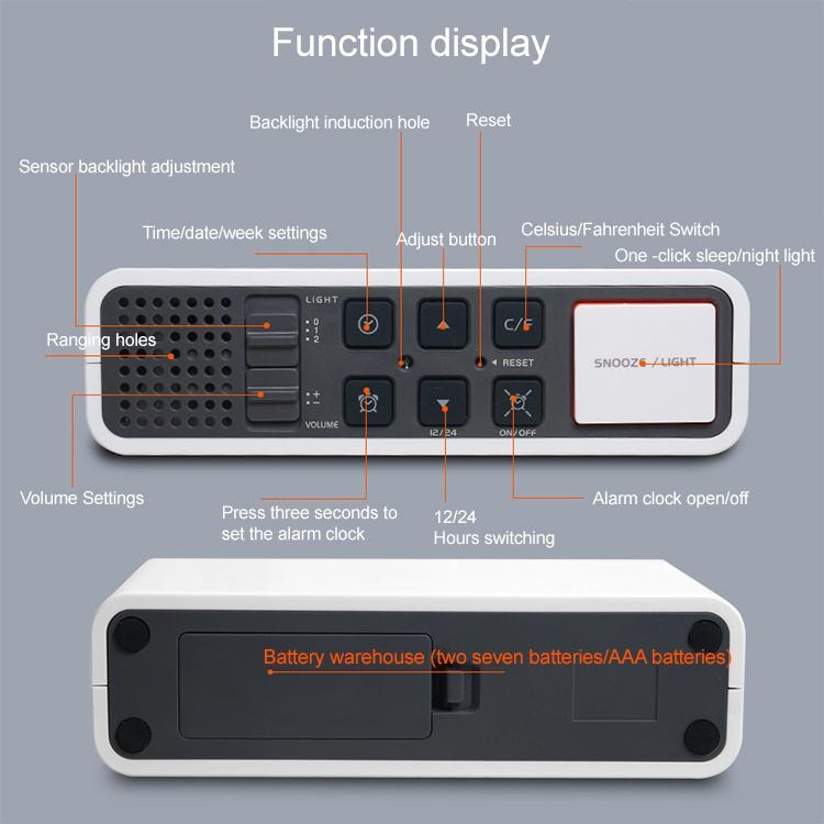 4. Functions: automatic sensing backlight/time display/date display/timed alarm clock/temperature detection/one button luminous/snooze function/humidity detection