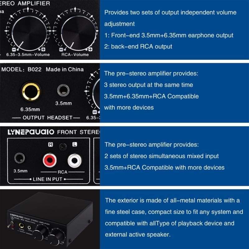5. The output has 2 groups of independent volume adjustment, 1 volume adjustment to adjust the 3.5mm and 6.35mm output. 1 volume adjustment to adjust the RCA output.