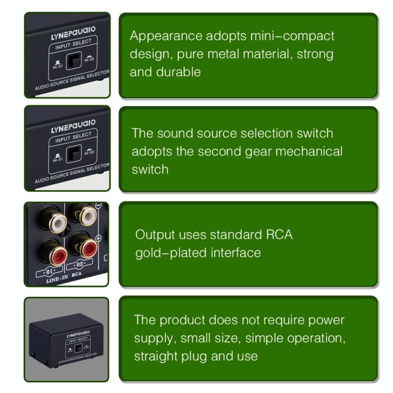 4. RCA interface design is used for product input and output standards, and the switch is designed with manual push-button switch of precise 2 positions.
