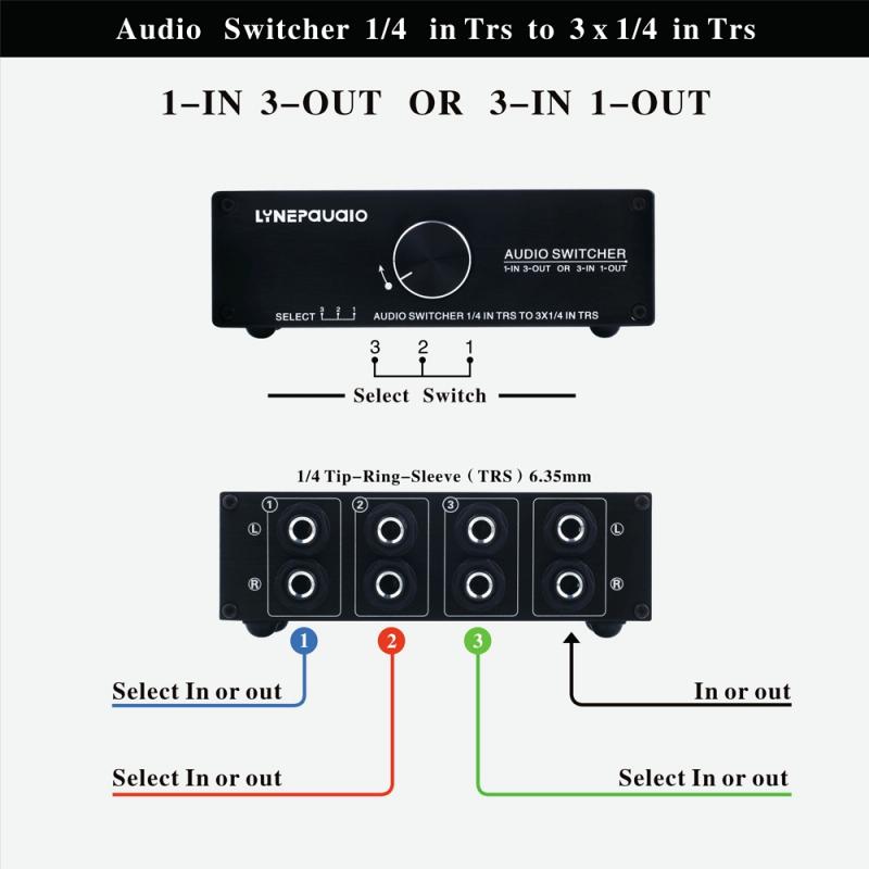 1. 1 input and 3 output or 3 input and 1 output of LINEPAUDIO products , passive stereo speaker audio switch, is a manual stereo speaker switch.