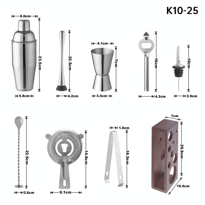 -K10-25 (set of 10): 700ml shaker x 1, crushed popsicle x 1, filter x 1, 15/30ml measuring cup x 1, bar spoon x 1, spout x 2, bottle opener x 1 , Ice Clip x 1, Wooden Frame x 1