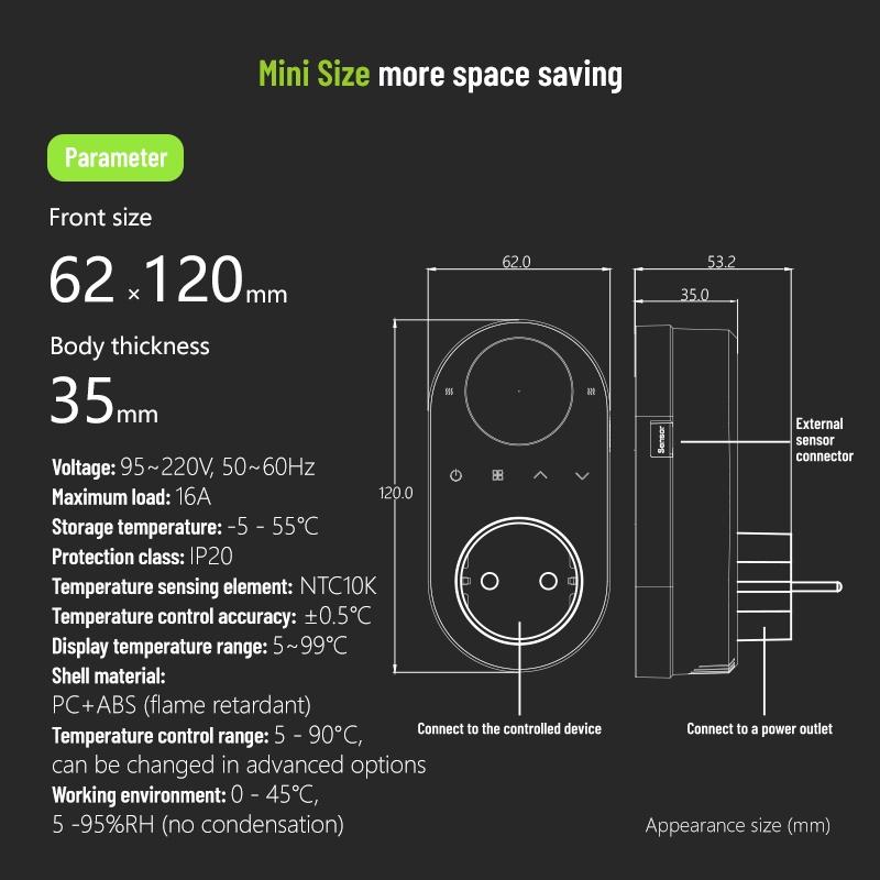 1. convertible temperature units (Celsius and Fahrenheit), 2 indicator lights to show the work status; And comes with 2.5m external sensor. Max 16A.