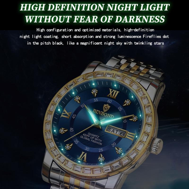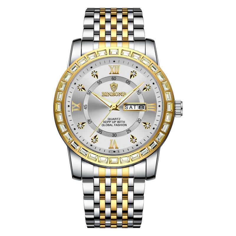 BINBOND B2202 Diamond Dual-calendar Luminous Quartz Watch, Color: Inter-gold-White (BINBOND)
