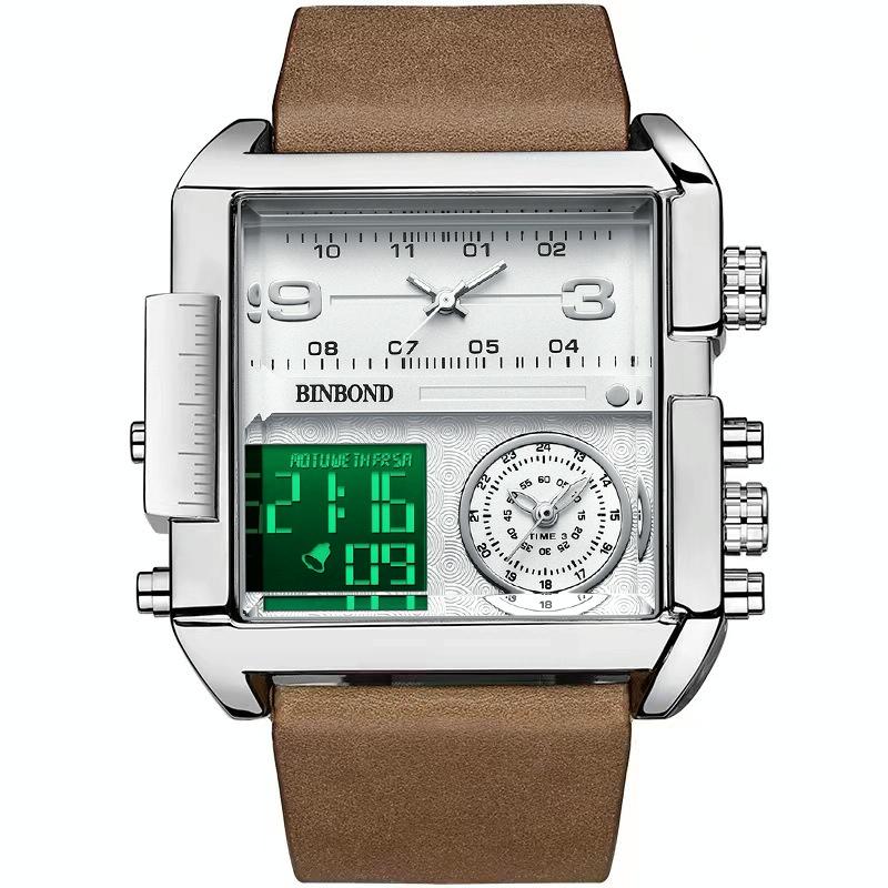 BINBOND B3332 Square Multifunctional Sports Quartz Waterproof Watch(Brown Leather-White-White) (BINBOND)