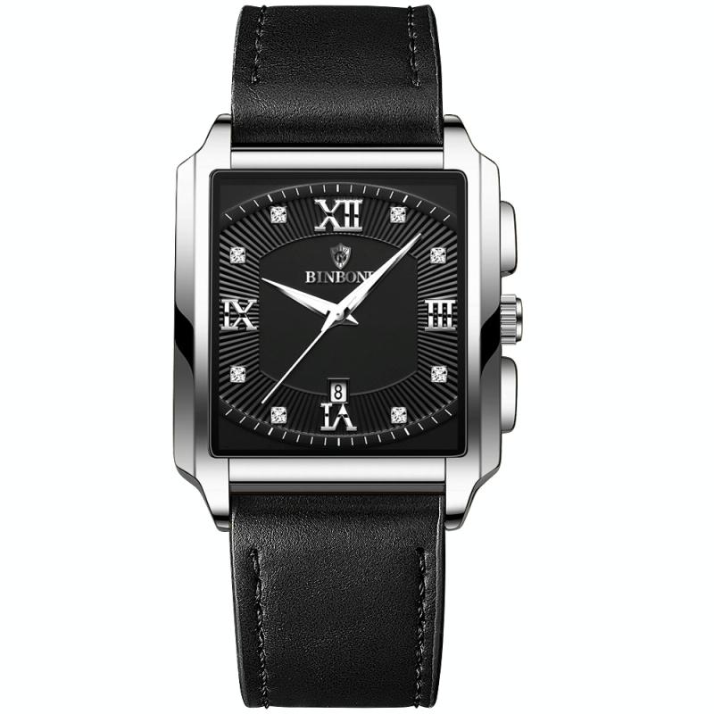 BINBOND B4143 Rectangular Outdoor Men Waterproof Quartz Watches(Black Leather-White Steel) (BINBOND)