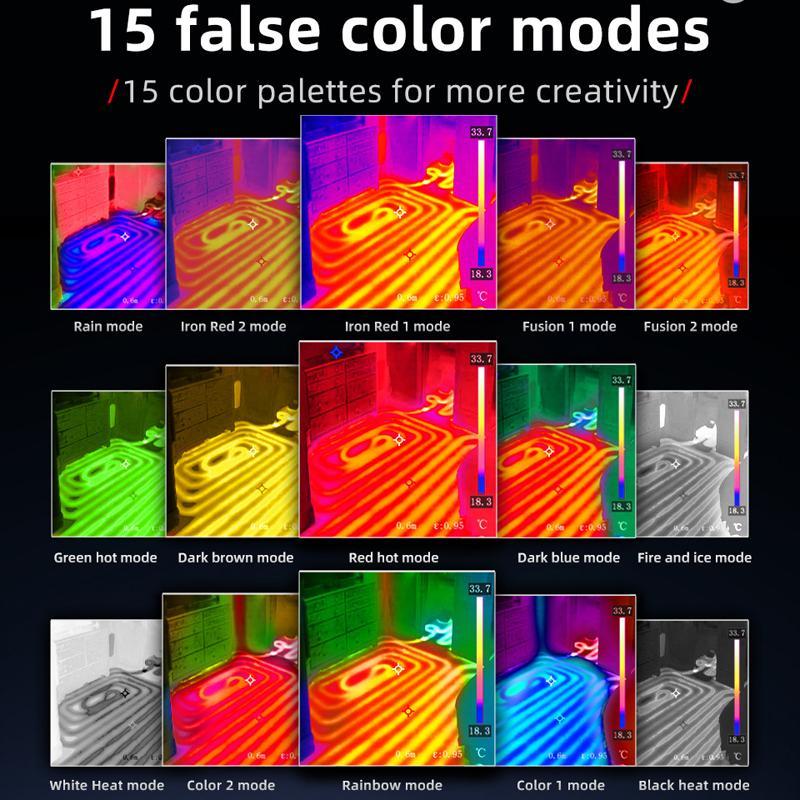 24. Color palette: white hot, black hot, fusion 1, rainbow, fusion 2, iron red 1, iron red 2, dark brown, color 1, color 2, ice fire, rain, green hot, red hot, dark blue