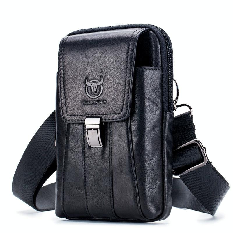 BULL CAPTAIN Multifunctional Leather Mobile Phone Small Waist Bag For Men(Vertical Black) (BULL CAPTAIN)